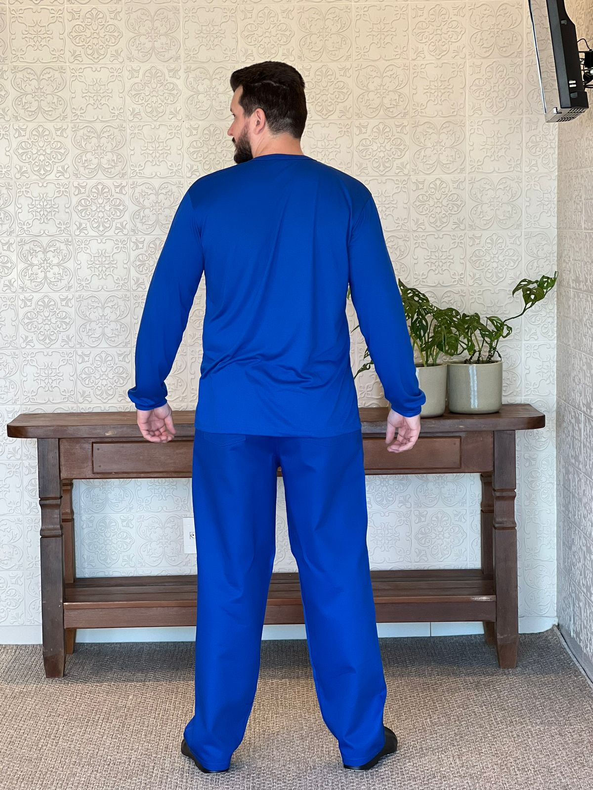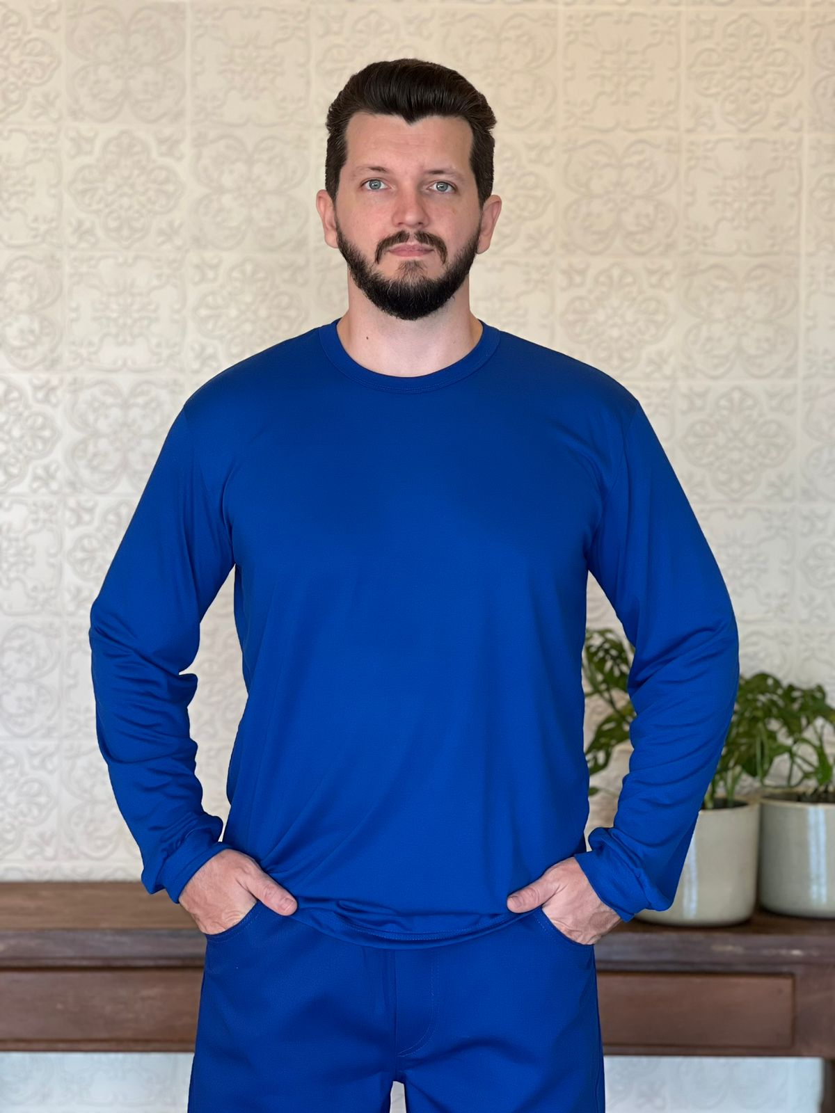 O kit é composto por 3 camisetas manga longa em tecido PV (malha fria), composição 67% Poliéster e 33% Viscose, com gola redonda e punho na manga, garantindo maior proteção contra o sol e excelente caimento.