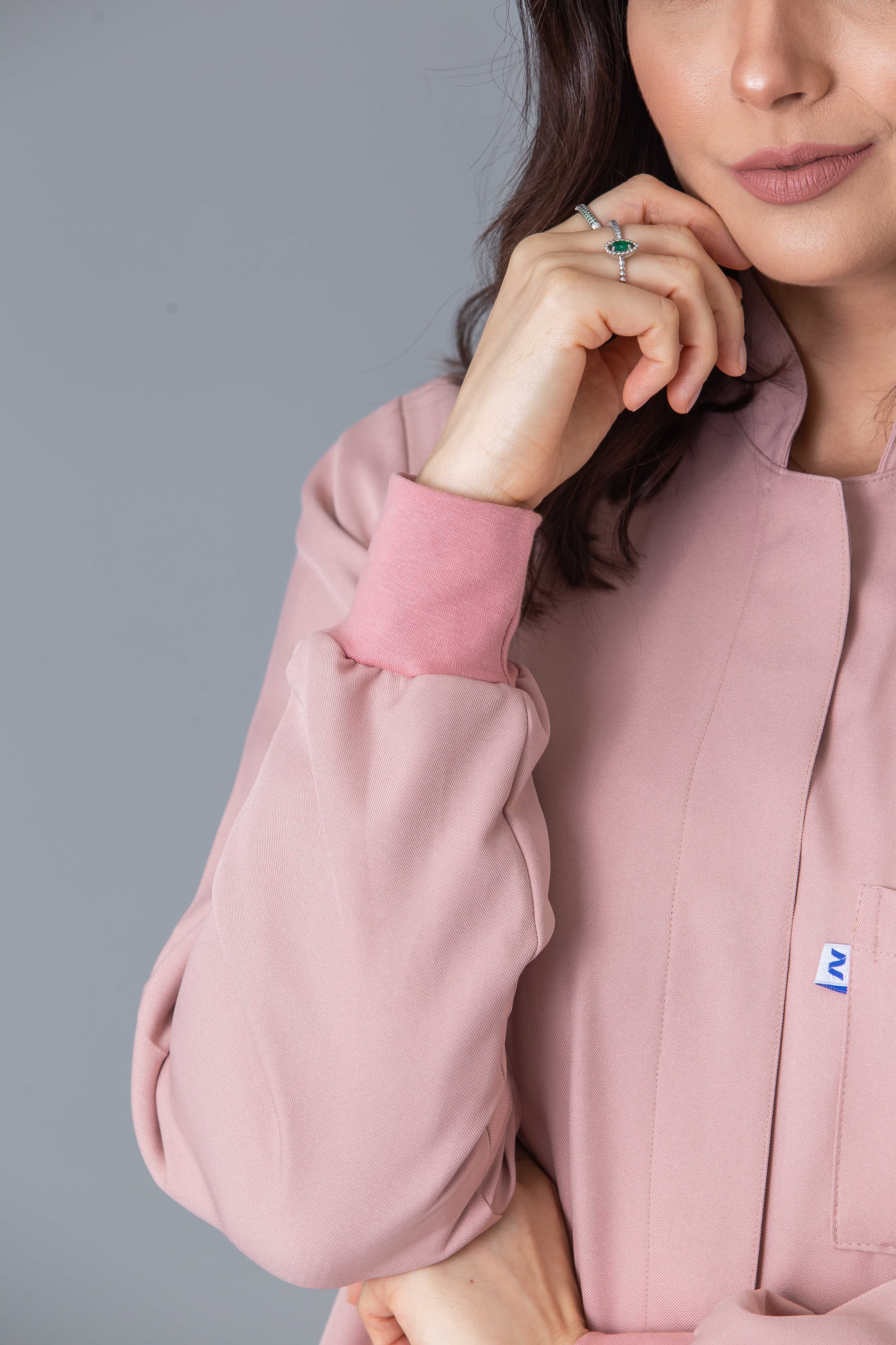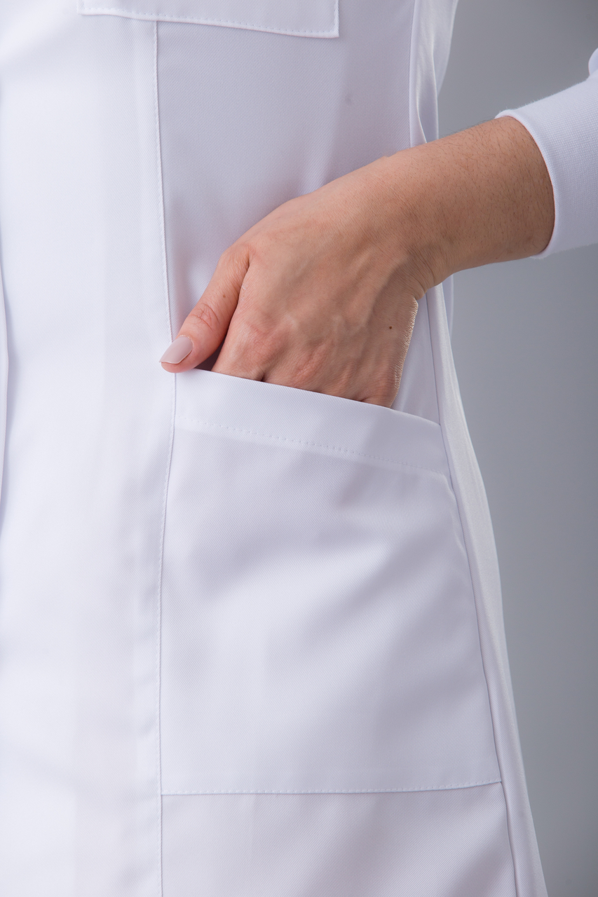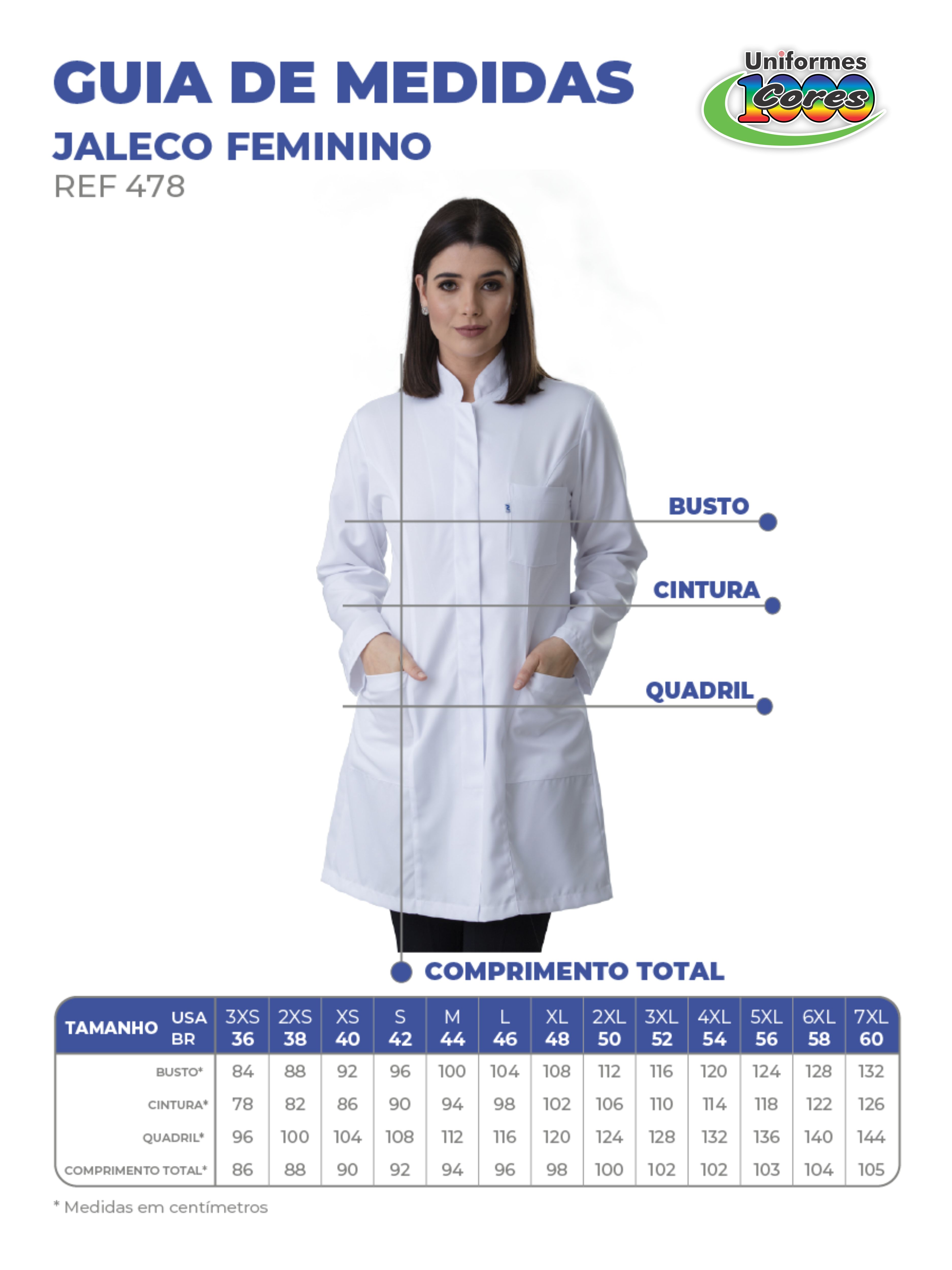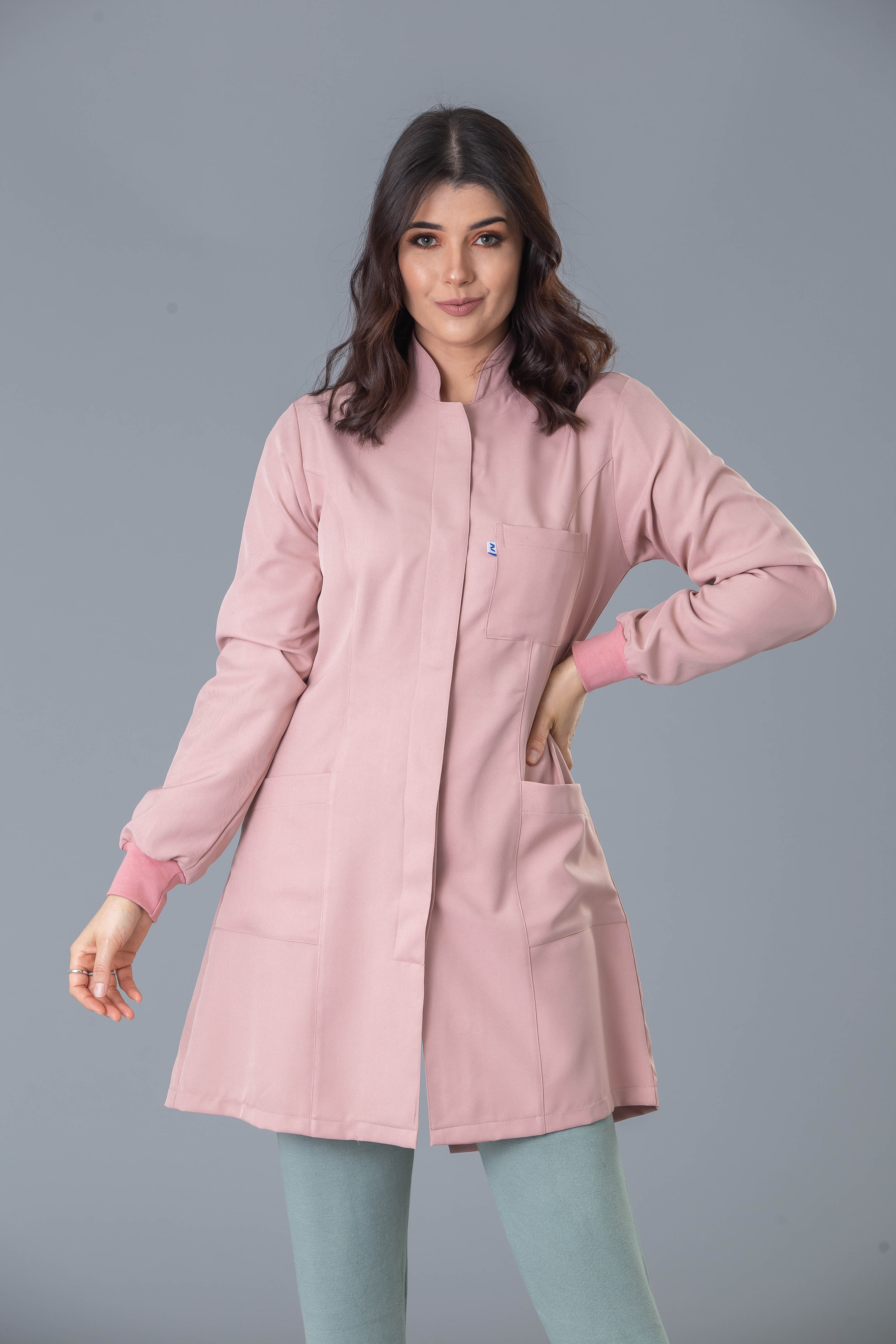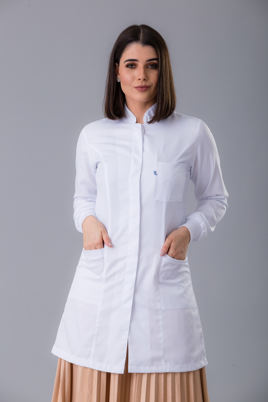 Gola padre com fechamento em botão, dois bolsos laterais e um bolso no peito esuqerdo, fechamento de botões centralizados e protegidos, jaleco cinturado.